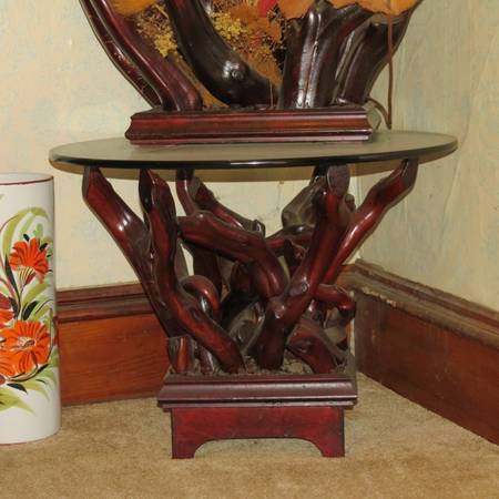 Vintage mid-century modern, large driftwood table and lamp. Table measures 20" tall. Glass top is 26". Lamp is 24" wide and 60" tall. Lamp has flat base and two lights. Pick up in Toledo. Will not ship unless you provide the packing and shipping company.
